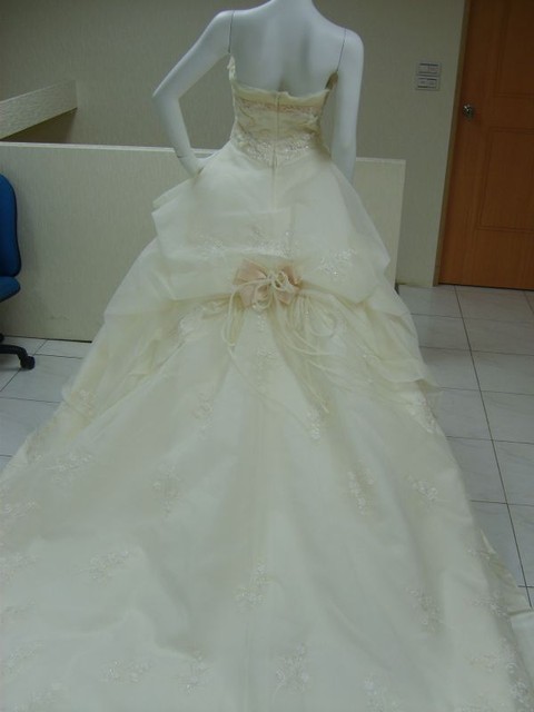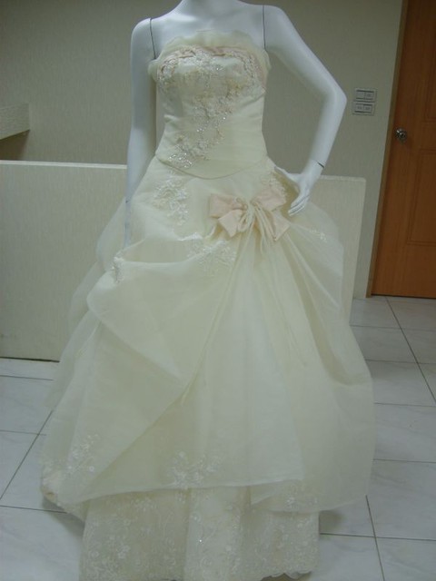 米黃色的白紗,別於一般絲質材料,這款設計真的很漂亮喔,幸運的小鬼剛好這時間點可以穿這套之前列為"加價區"的白紗,提早來的朋友可以摸一下白紗材質喔,粉優的,裙襬長又長