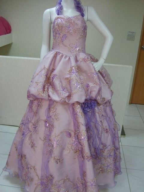 這套是加價禮服,也就是老大多掏錢讓小鬼穿的,因為是設計師設計的新款,所以由小鬼第一次穿,紫色的彩度很"ㄅ拎",剛好也是小鬼愛的顏色,繞頸的設計很特別的喔