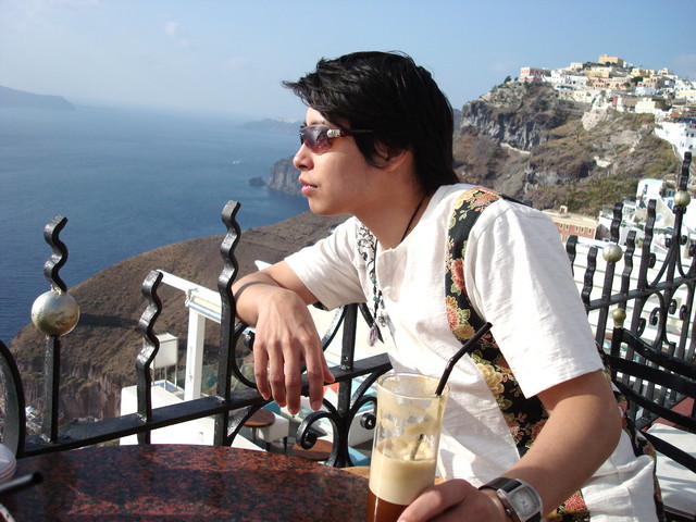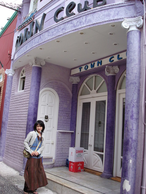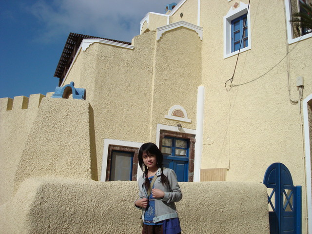 中午回到Santorini首府用餐,看到這一棟紫色系的房子,讓小鬼整個撲了上去,狂叫老大快點拍照