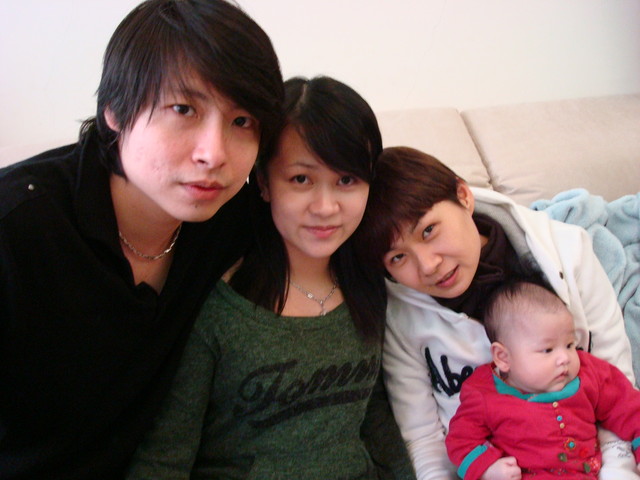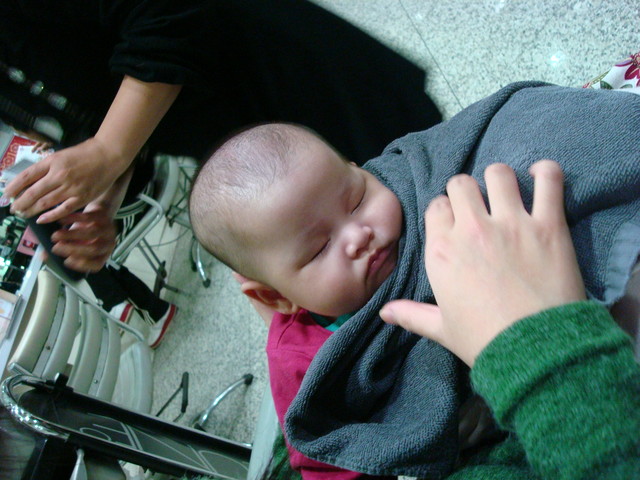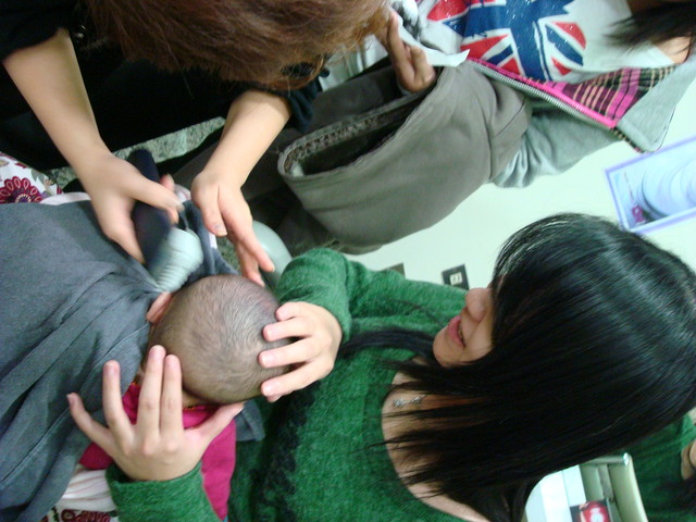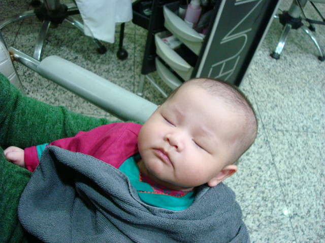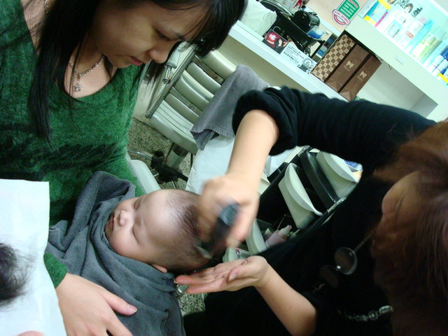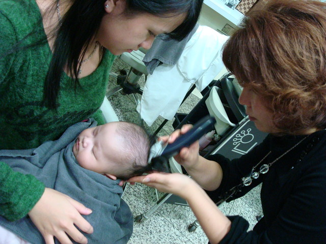 小鬼負責抱,老大負責拍照,Q姨則是負責收好胎毛;一次動員三個人伺候著