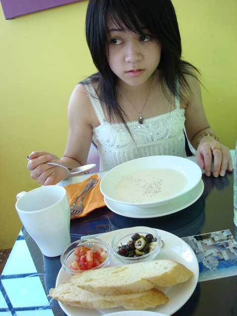 位於基隆瑞芳,聽餐廳名字就知道是跟地中海式建築有關係,外牆是藍白色系的,裡面的卻是很傳統的黃、紅暖色系,整個就像希臘的建築(真正的希臘,可不是只有白藍色系喔)平日的午後照理說用餐人員應該不多,應該是假日比較多,可是今天卻是整個室內都沒有空位,好險老大有訂位捏