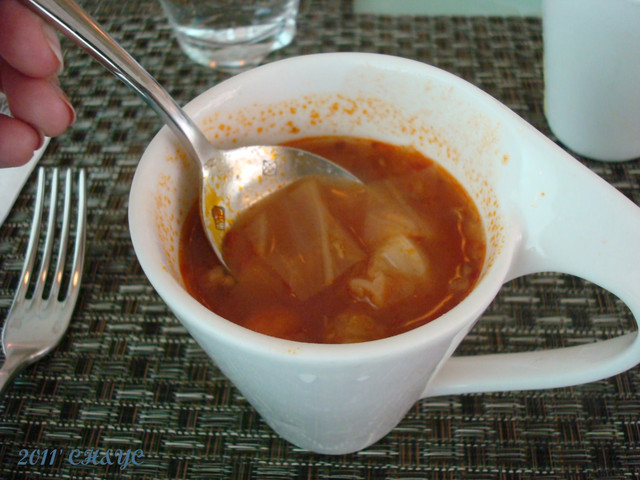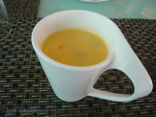 南瓜湯&蔬菜湯 用杯子當湯碗,真的很特別,湯的份量當然不會很多,不過不錯喝,南瓜很濃郁、蔬菜略帶酸