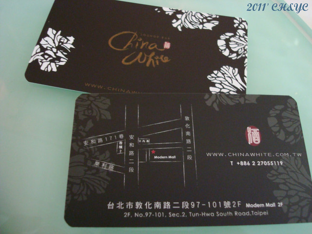 位於敦南摩天大樓 2樓的China White,起先餐廳位子真不好找(因為走錯大門),China White乃一結合傳統中國元素與時尚流行風格之Lounge餐廳,提供無國籍創意料理&新鮮水果調酒,會來這用餐當然也是因為,離小鬼公司近(可是不開車還真要走一段路)