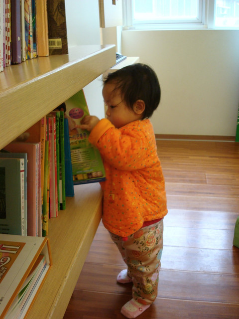 還有整面書櫃,裡面當然是擺著童書,玩玩了木偶改看書籍的可娃,完全不理會另一邊的玩具區