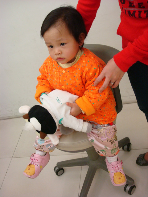 正在等候醫生,乖乖抱著護士姐姐提供的牛娃娃(又在皺眉頭)
